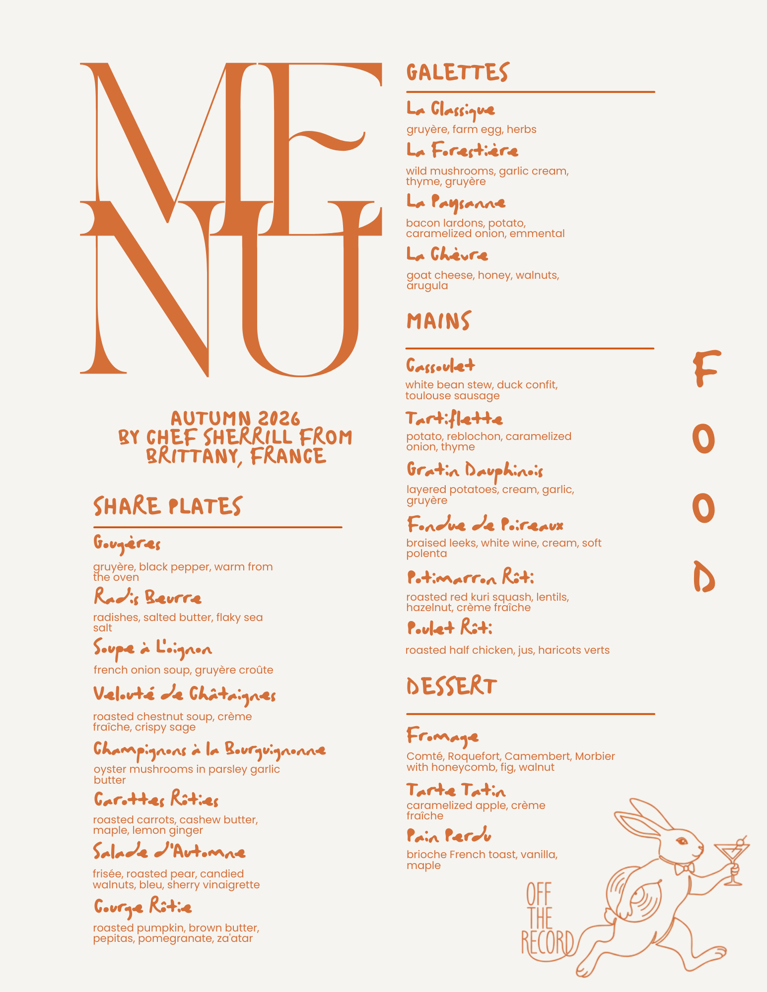 Held on a wooden clipboard, easy to change, simple and chic. The rabbit presides, abstract circles add texture and hand-lettered section headers tie back to the wordmark.